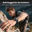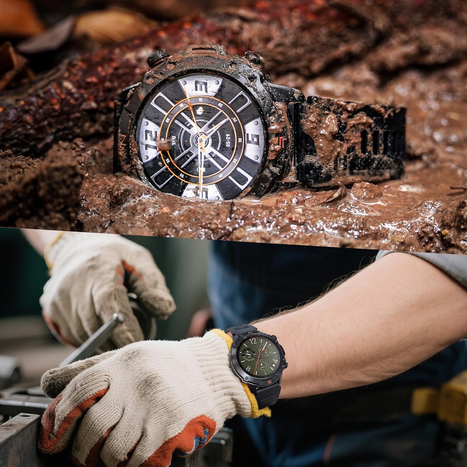 Diseño de pantalla de grado militar: diseñados para el exterior resistente, los relojes inteligentes militares WalkerFit para hombre cuentan con una estructura de grado militar con un cuerpo ultra duradero y una vívida pantalla AMOLED de 1.43 pulgadas siempre encendida. Permanece visible incluso bajo la luz solar directa durante la escalada en roca. Potencia sostenida de más de 60 días: diseñado para la resistencia, este reloj inteligente para hombre ofrece una potencia de espera de 60 días y un funcionamiento continuo de 15 días. El avanzado sistema de carga magnética alcanza toda la potencia en 2 horas, manteniendo un rendimiento confiable durante entrenamientos prolongados o excursiones al aire libre. Brújula integrada para exteriores: conquista el terreno más duro con este resistente reloj inteligente hecho para escaladores, corredores y aventureros. Construido con brújula, resistencia al agua 3ATM, construcción anticaídas y una carcasa resistente a los arañazos, soporta polvo, impactos y rasguños rocosos durante caminatas y subidas. Más de 170 modos deportivos, listo para nadar: con más de 170 modos deportivos integrados, desde correr, golf hasta béisbol, este reloj inteligente para exteriores se adapta a tu rutina de fitness. Su calificación de impermeabilidad de 3 ATM lo hace perfecto para sesiones de natación o carreras lluviosas. Sigue cada movimiento con precisión y mantente motivado sin importar el clima. Seguimiento de salud durante todo el día: este reloj de fitness soporta el seguimiento de la salud 24/7, incluyendo patrones de frecuencia cardíaca, sueño, estrés, respiración y tendencias emocionales. El reloj con monitor de frecuencia cardíaca WalkerFit utiliza el último algoritmo Savvy para lecturas precisas incluso durante actividades de alta movimiento como correr, HIIT o escalada. Llamadas manos libres en el sitio: en sitios de trabajo ruidosos donde tus manos están ocupadas y tu teléfono está fuera de alcance, este reloj inteligente Android compatible con iPhone se convierte en tu salvavidas. Con un altavoz integrado de alto volumen y una conexión Bluetooth estable, puedes responder y hacer llamadas directamente desde tu muñeca, sin necesidad de dejar de funcionar o buscar tu teléfono, para trabajadores de la construcción 【Más características, diseño listo para regalar】Personaliza tu aspecto con más de 400 caras de reloj y opciones de correa doble, mientras disfrutas de soporte para más de 30 idiomas. Desde el seguimiento del podómetro hasta el control de música, además de características de comodidad como facilidad de uso/accesos directos, este reloj inteligente para hombre está diseñado para la vida moderna. Con una caja premium y atractivo multifunción, es un regalo ideal para cumpleaños, vacaciones o Día del Padre. Reloj inteligente negro para hombre